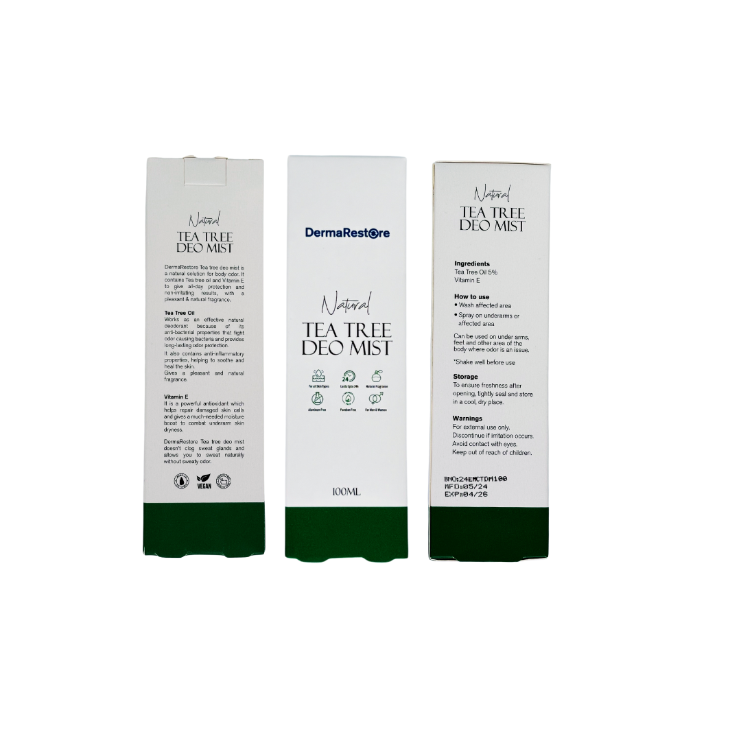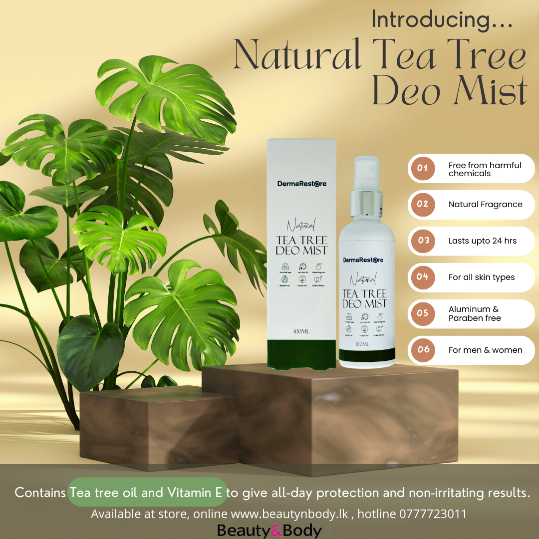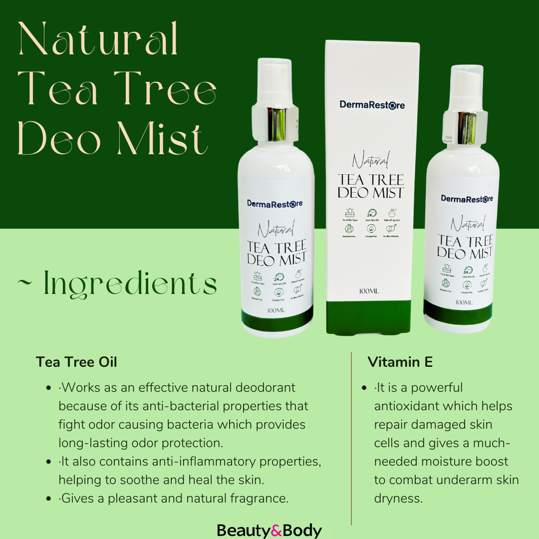 Natural Tea Tree deo mist is a natural solution for body odor. It contains Tea tree oil and Vitamin E to give all-day protection and non-irritating results. Natural Tea tree deo mist doesn’t clog sweat glands but prevents sweaty odor naturally.